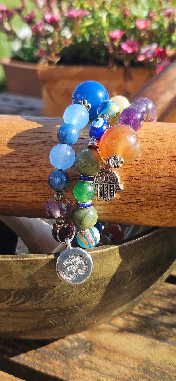 Handgemaakte armband met verschillende kleuren agaat, serpentijn en geblazen glasbeads