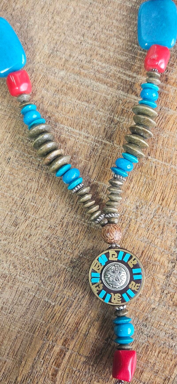 Very long necklace monkstyle out of turqueniet, howliet en wooden beads recycled from a real monkchain.