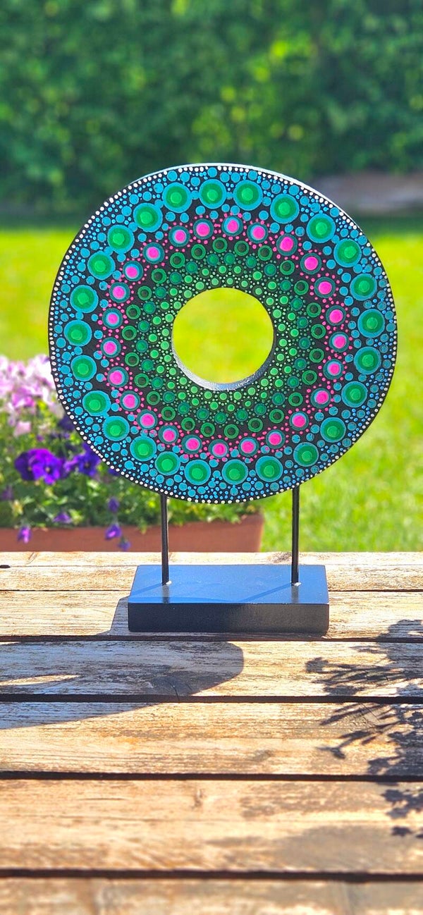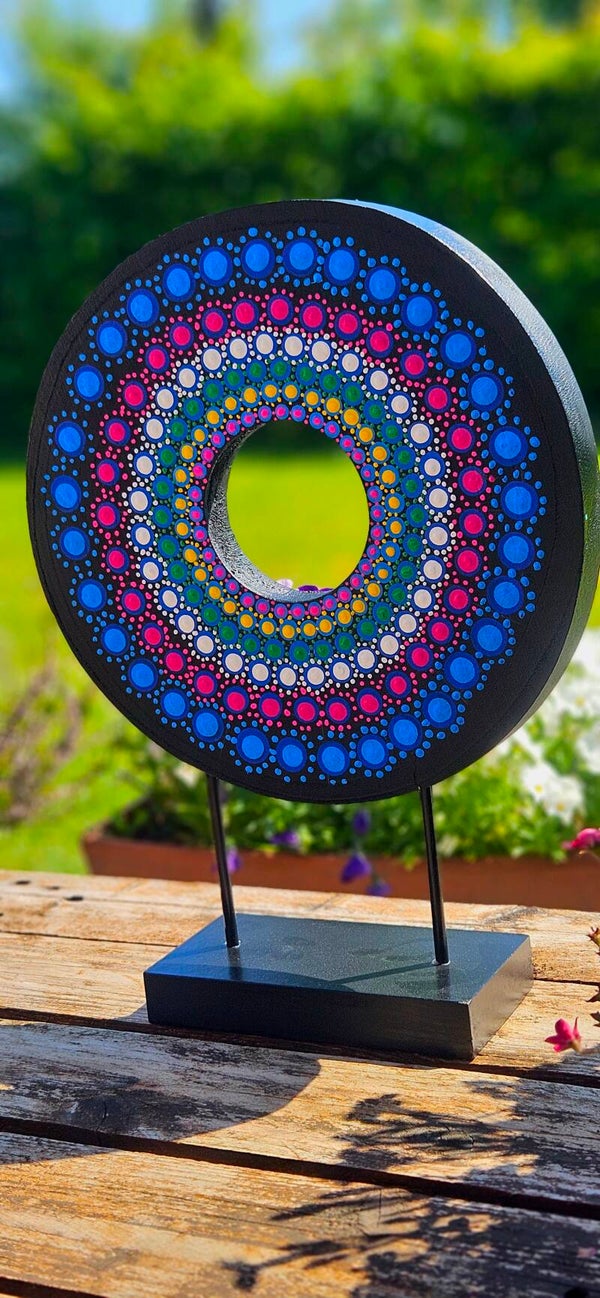 Deco Moodcirkel waarvan 2 zijdes beschilderd met verschillende kleurenpatronen. Welke kant komt overeen met je Mood vandaag?